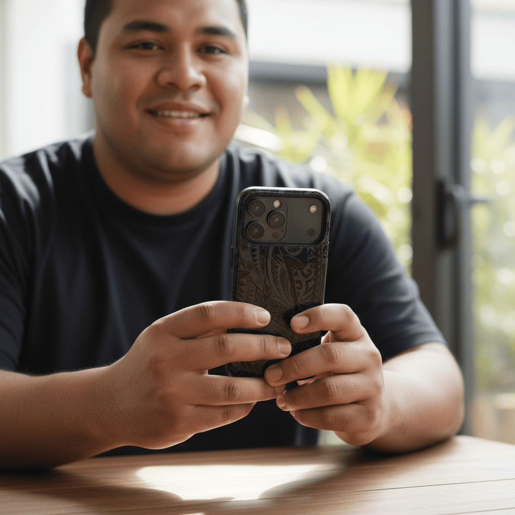 Translucent Pasifika motifs float above your phone colour for a look that’s uniquely you.